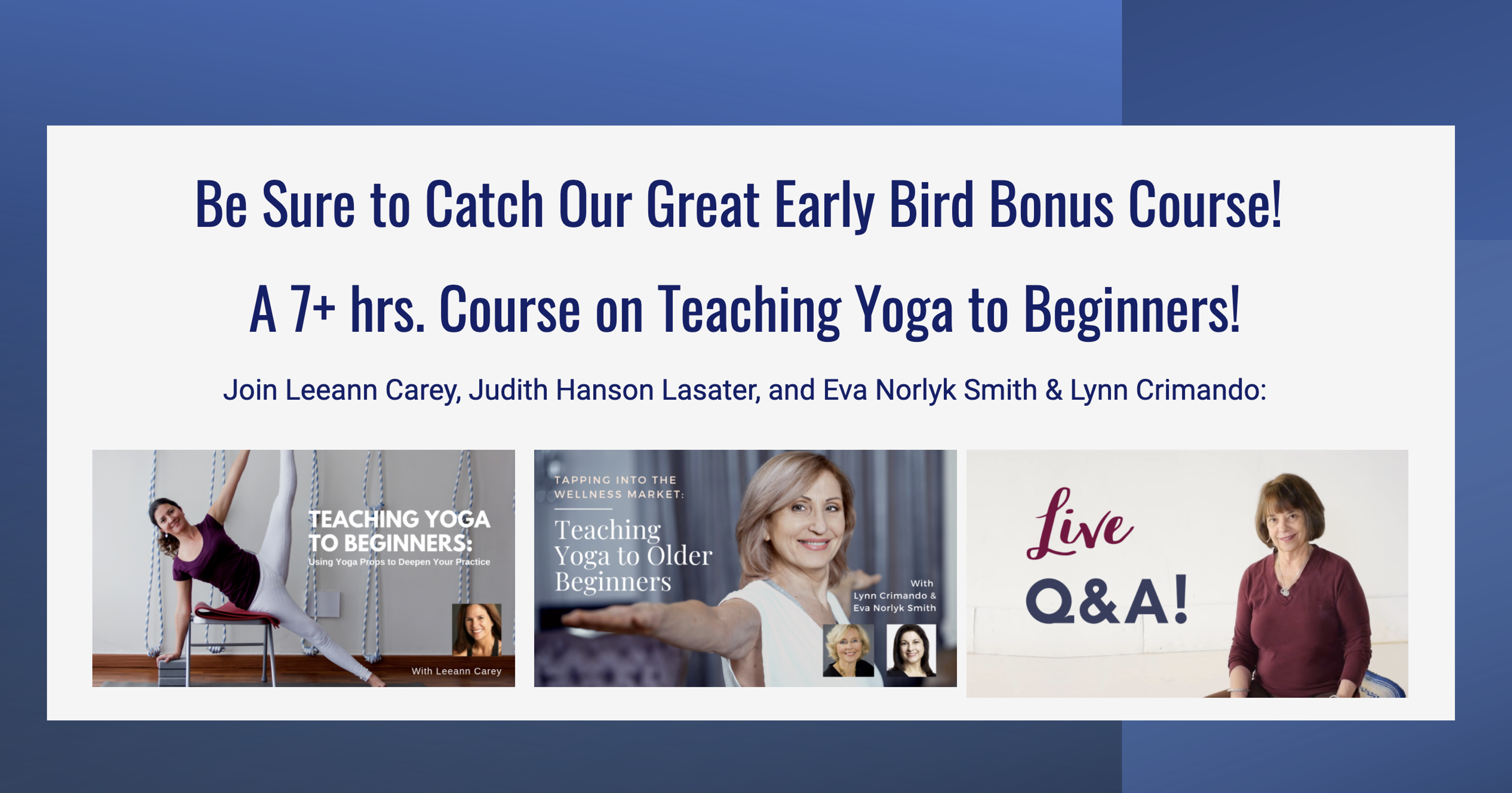 In addition, join Ellen Saltonstall and yoga therapist Lynn Crimando for an exciting live online weekend immersion July 23-25. Learn how to structure and teach a 6-Session course on Yoga for Osteoporosis, which creates the progression of learning the students need and are looking for.